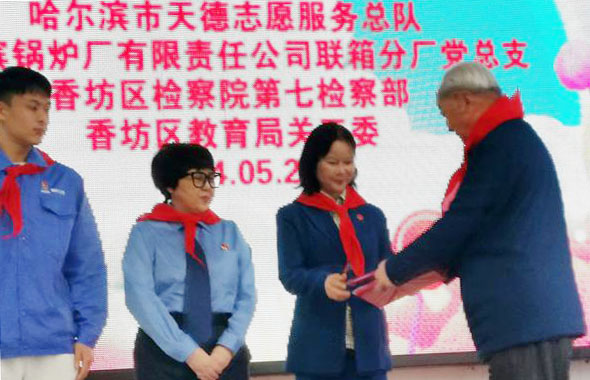 捐赠活动由哈尔滨市香坊区关心下一代工作委员会组织。区关工委主任孙凤祥为捐赠单位颁发荣誉证书。香坊区教育局副局长孙清,哈尔滨市天德慈善公益发展服务中心主任崔玉兰和爱心人士赵祥龙、王玉林、刘茂田及哈尔滨市锅炉厂有限责任公司联箱分厂党总支、香坊区检察院第七监察部等同志到会参加了此次捐赠活动。
