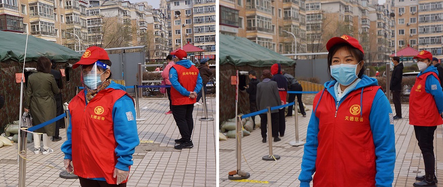 位于香坊区红旗大街、轴承街、卫生街合围区域的白毛小区,面积大、人口多,区内街道纵横,商铺林立,核酸检测任务极其繁重。天德慈善的崔玉兰主任得知这一情况后,决定组织志愿者前往支援。但面对全市小区均处于封控状态,严格管控居民出行的情况下,召集志愿者的难度可想而知。崔玉兰主任在向天德慈善的爱心人士发出志愿服务号召的同时,连夜与有意参与志愿服务的相关人员紧急沟通,了解和评估他们所处社区的疫情防控情况。在与白毛小区的社区领导确定工作任务后,天德慈善为确定参与志愿服务的人员开出了证明。崔主任个人还自费为志愿者购置了医用口罩、防护手套和面部防护罩,配备了统一的服装、帽子。