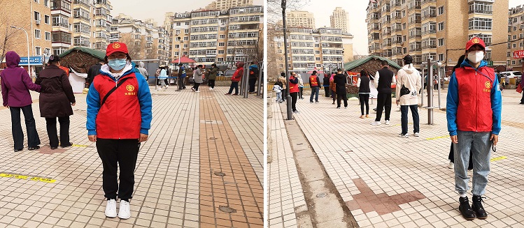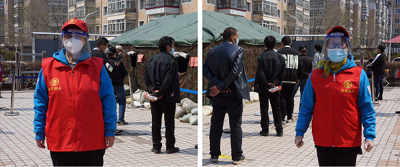 哈尔滨疫情防控第60号公告发布后的那几天,哈尔滨出现了罕见的低温,有时还大风伴着雨水。参与志愿服务的志愿者为了防寒和标识醒目,一律内穿“黑龙江天德健康产业发展有限公司”的天蓝色绒衣工作服,外穿天德慈善的志愿者红马甲,既解决了御寒的问题,也成了志愿服务现场的一道亮丽醒目的风景线