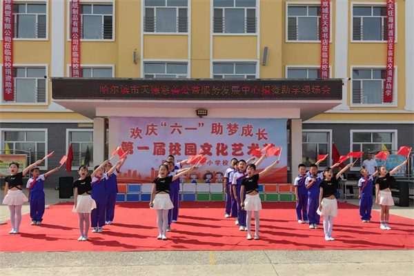 31日一大早,天德慈善等社会各界的爱心人士便驱车前往位于距离市区五十多公里外的双城区第十一小学。此时的双城区第十一小学校园广场已是彩旗飞舞,歌声飘扬;身着节日盛装的进城务工子女们,个个脸上洋溢着喜悦笑容 。全校各个班级的学生都排练了精彩的节目,孩子们的精彩演出深深的感染了现场的每一个人。