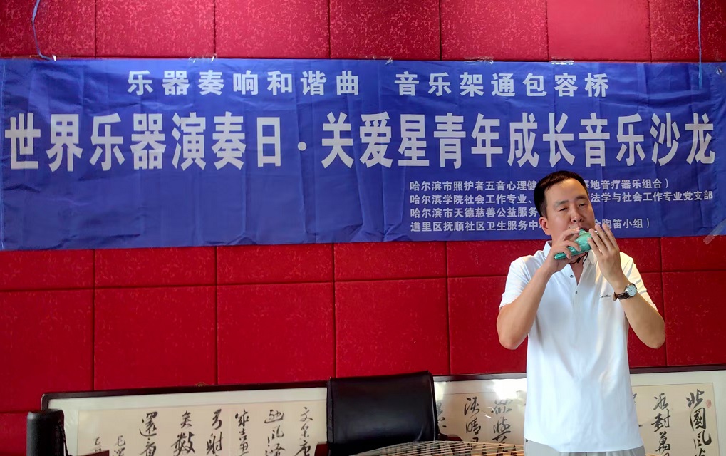 活动开始,哈尔滨市照护者五音心理健康中心的创始人赵振军重点介绍了创建陶笛小组的初衷,借助陶笛非语言乐器表达心中的情绪、情感,演奏中的互动,强化了人际交往和沟通体验,为融入社会作好铺垫。此次活动方案设计中的各个环节及实施过程,都体现了包容、理解、接纳与共情。也展示了前期心理康复训练的变化和阶段性成效。