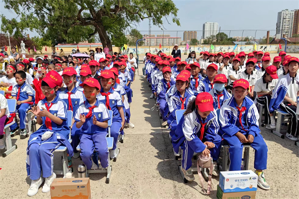 天德慈善给送给全校700名学生们每人一顶印有“中国少年”字样的小红帽及一些其他学习用品。同学们挥动着手中的小红帽,使校园广场立即变成了红色的海洋。