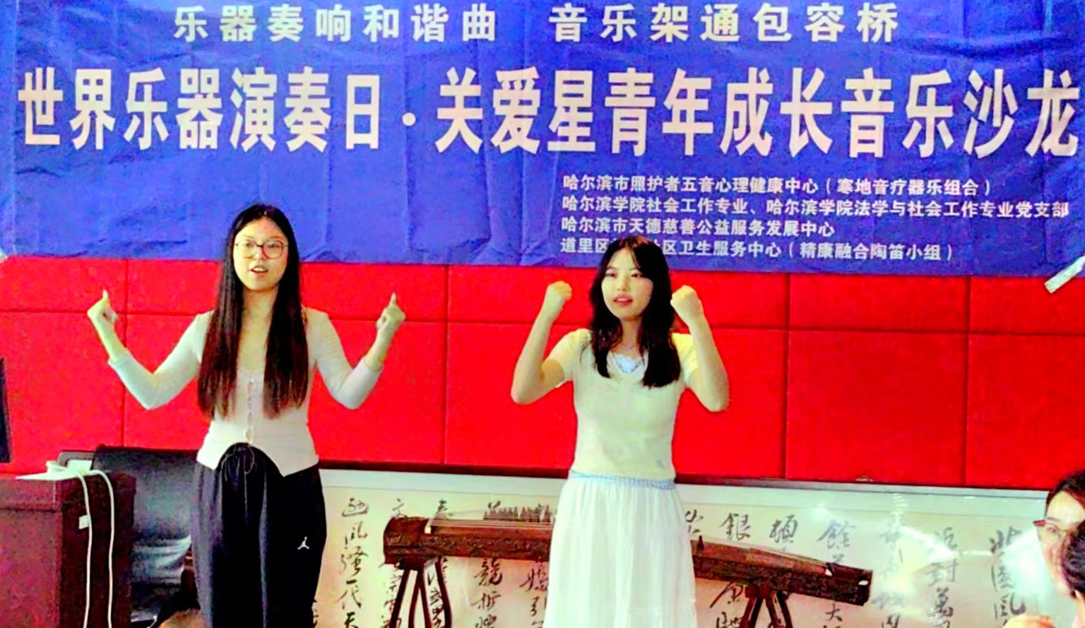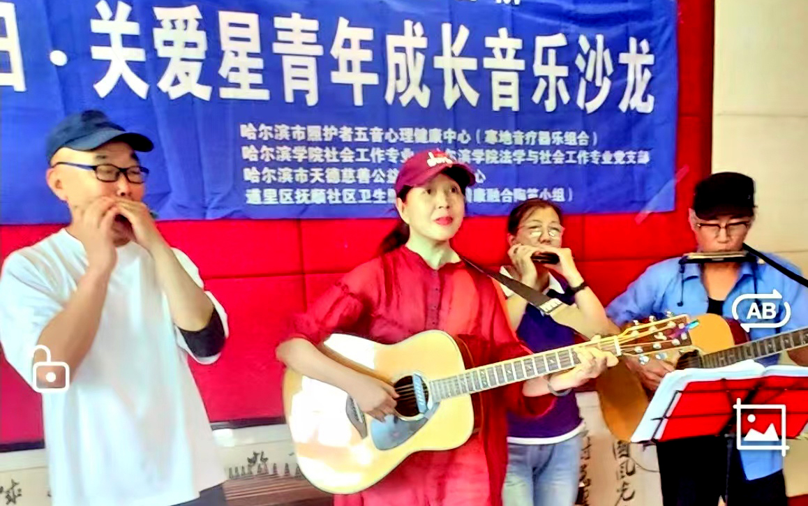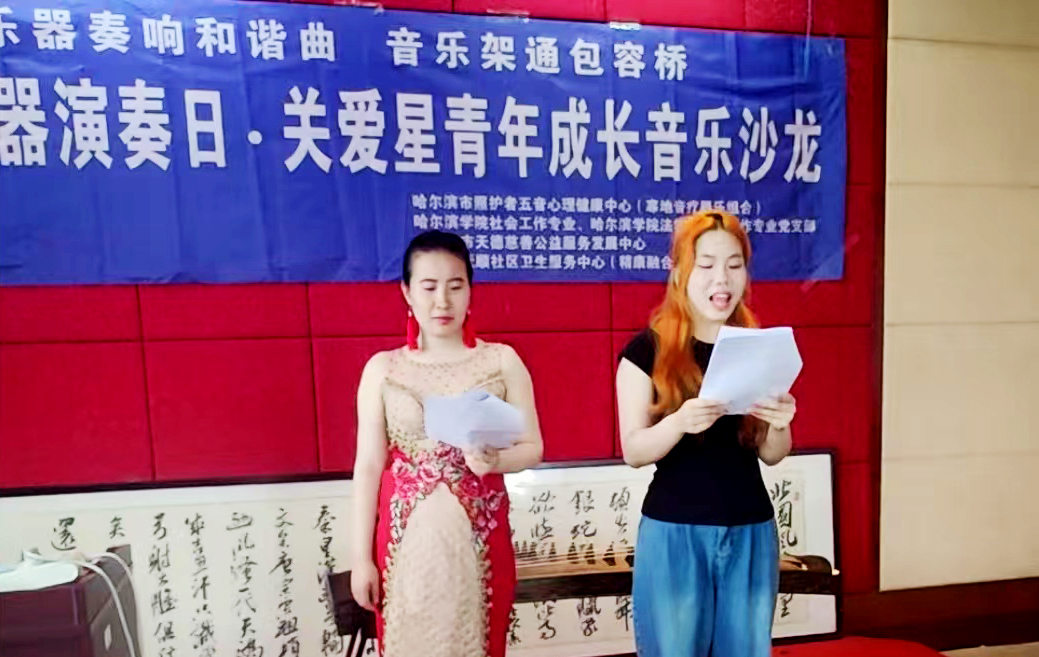 活动在市照护者五音心理健康中心“寒地音疗器乐组合”奏响的音乐声中开始。哈尔滨学院文法学院社工专业的学生和星青年的代表联袂主持了这场音乐沙龙活动。