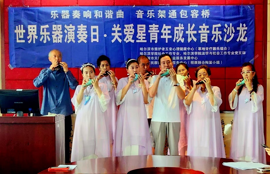 活动开始,哈尔滨市照护者五音心理健康中心的创始人赵振军重点介绍了创建陶笛小组的初衷,借助陶笛非语言乐器表达心中的情绪、情感,演奏中的互动,强化了人际交往和沟通体验,为融入社会作好铺垫。此次活动方案设计中的各个环节及实施过程,都体现了包容、理解、接纳与共情。也展示了前期心理康复训练的变化和阶段性成效。